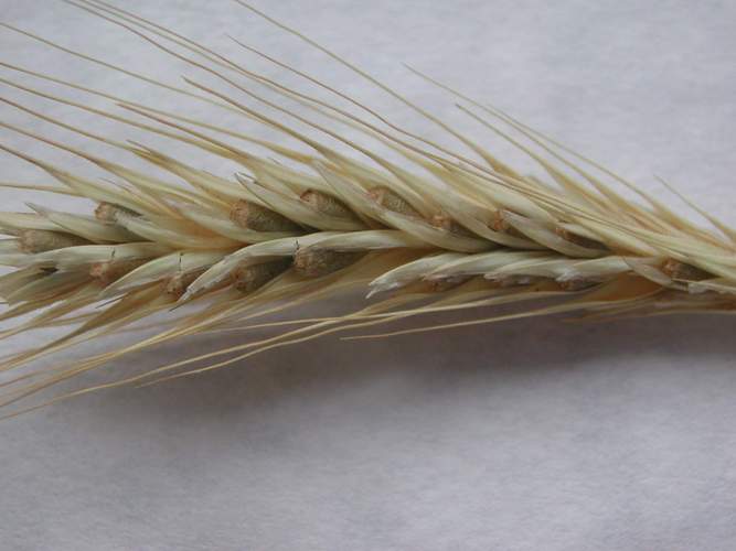 Klas žita setého - zelenavé obilky z květních obalů vyčnívají